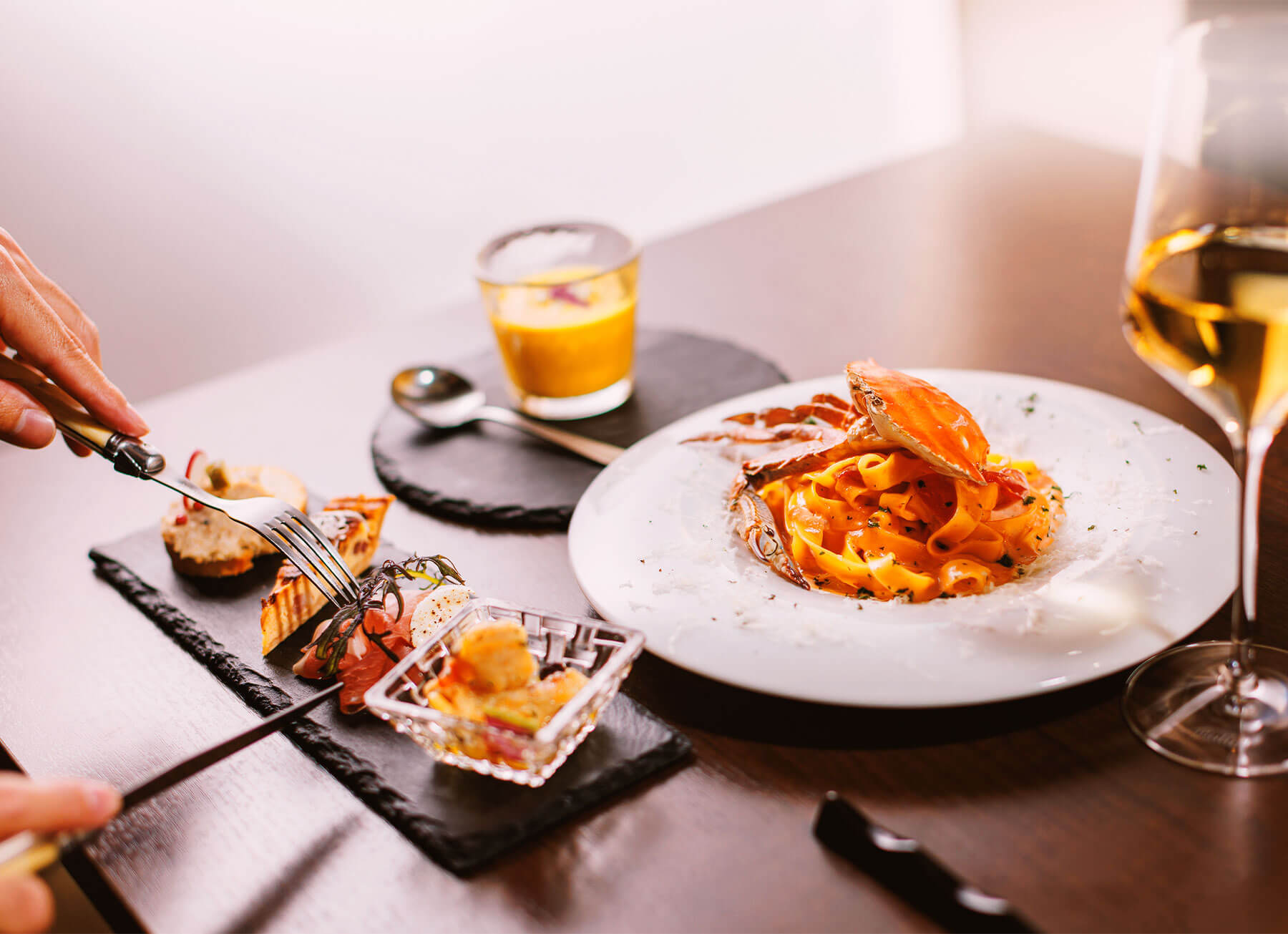 ディナータイムを彩るコースは、用途に合わせて数種類からお選びいただけます。夜はアラカルトもございますが、まずは当店の魅力を詰め込んだコース料理がおすすめです。