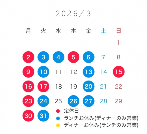 上本町のイタリアン「MILLE FIORI」のブログ 3月の営業日(変更になる場合があります)